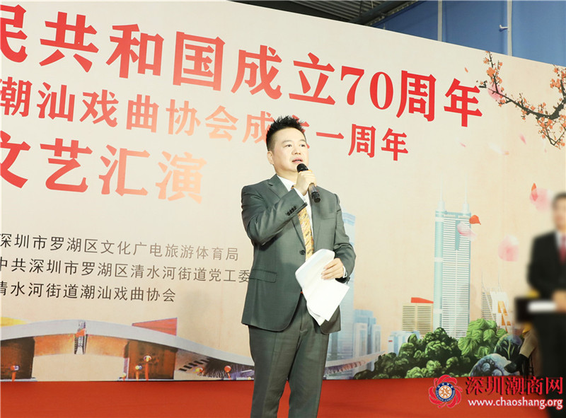 深圳市清水河潮汕戏曲协会会长、我会副会长王楚群对各位领导嘉宾的到来表示热烈的欢迎和衷心的感谢。他表示,金秋十月,我们迎来了中华人民共和国70周年华诞。在这个盛大而特殊的时刻,我们欢聚一堂,举办此次纪念活动,弘扬中华民族传统文化。对于中国人民来说,新中国成立70周年以来的不平凡历程,充满奇迹,充满辉煌。让我们永远铭记既往的奋斗历程,紧紧抓住眼前的历史机遇,万众一心,不懈求索,奋发有为,不断开创新局面,在实现中华民族的伟大复兴上阔步前进。