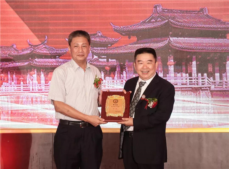 清远市政协主席梁志强(左)为清远市潮汕商会会长郑文雄(右)授牌