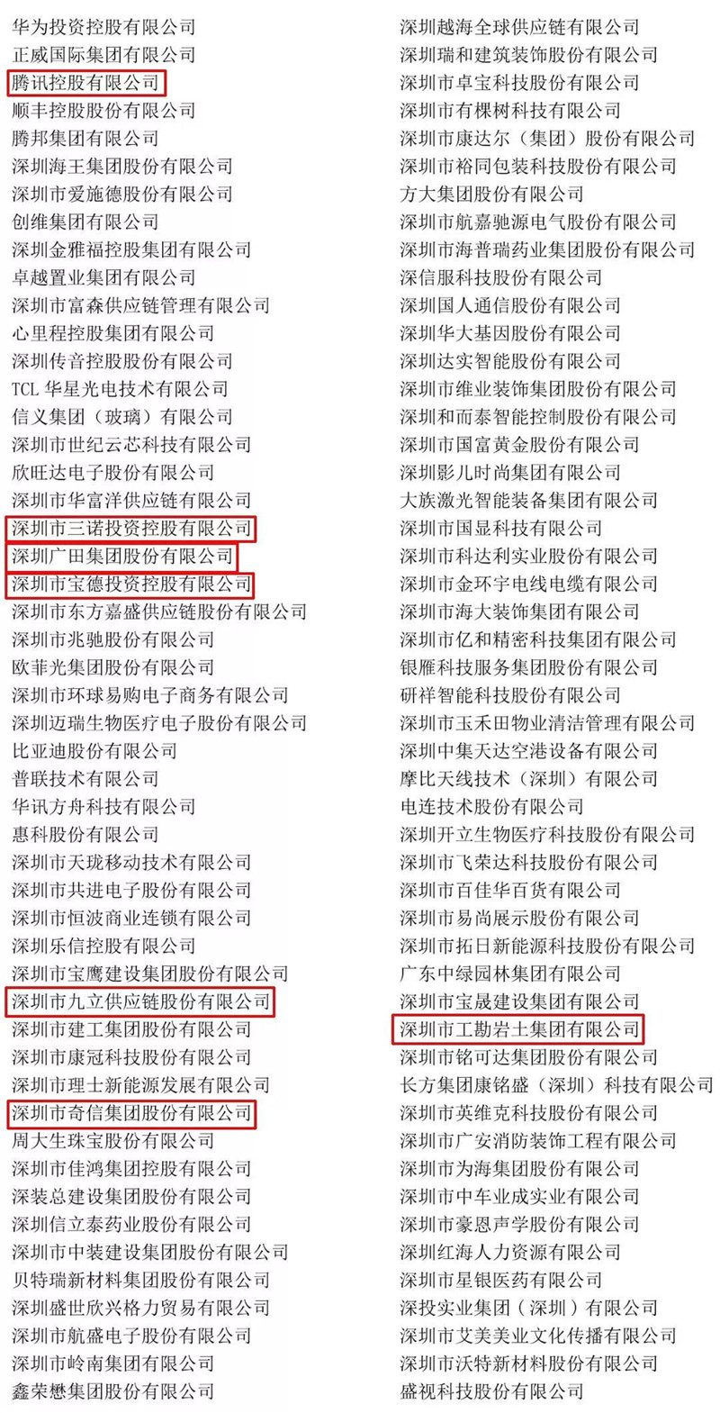 我会荣誉会长单位腾讯控股有限公司,名誉会长单位深圳市宝德投资控股有限公司、深圳广田集团股份有限公司、深圳市奇信集团股份有限公司、深圳市三诺投资控股有限公司、深圳市工勘岩土集团有限公司,常务副会长单位深圳市九立供应链股份有限公司等荣获“2019年度深圳市民营领军骨干企业”称号;