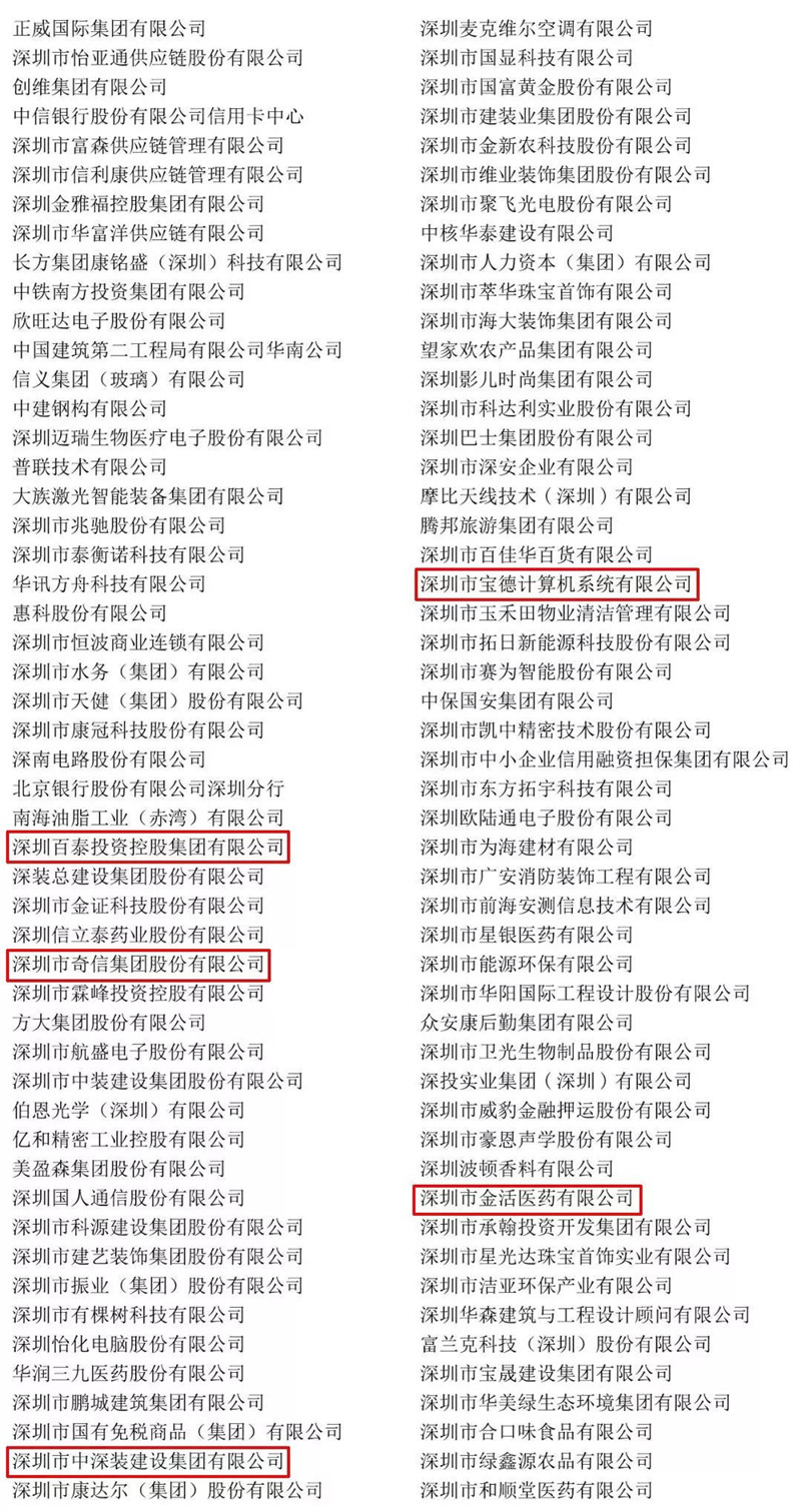 我会名誉会长单位金活医药集团有限公司、深圳市宝德计算机系统有限公司、深圳市奇信集团股份有限公司、深圳百泰投资控股集团有限公司、深圳市中深装建设集团有限公司等荣获“第三届深圳质量百强企业”称号。