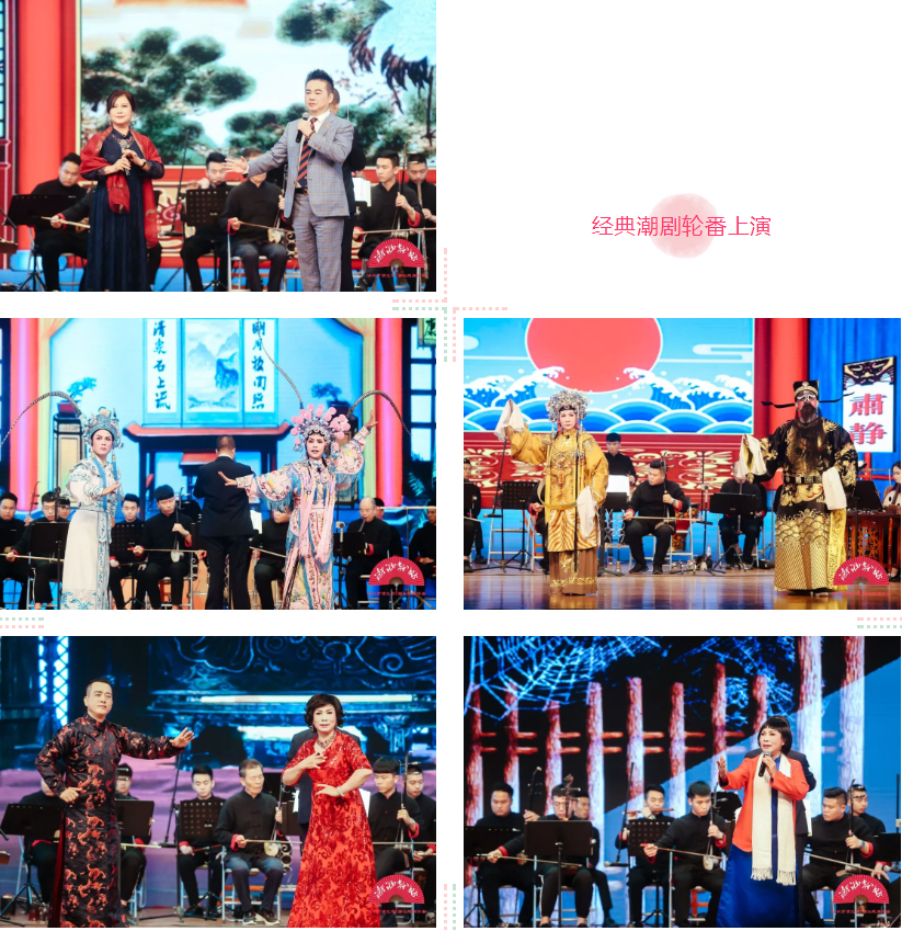 紧接着《你我皆是忠良后》《夫人且息恼》《相伴永同心》《华容放曹》《芳心长幕英雄汉》《满怀热血荡激情》等一批新老潮剧经典一一上演,令现场高潮迭起,掌声不断。台上演员以收放自如的演绎和灵动的唱腔,获得了观众的满堂喝彩。