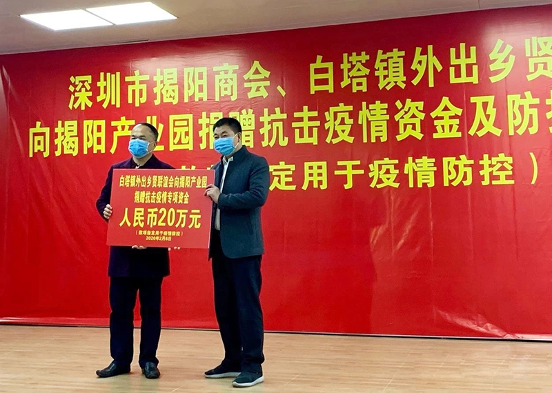 深圳市揭阳商会执行会长、白塔镇外出乡贤联谊会会长邱杰钦代表白塔镇外出乡贤联谊会向揭阳产业园捐赠抗疫专项资金20万元人民币。