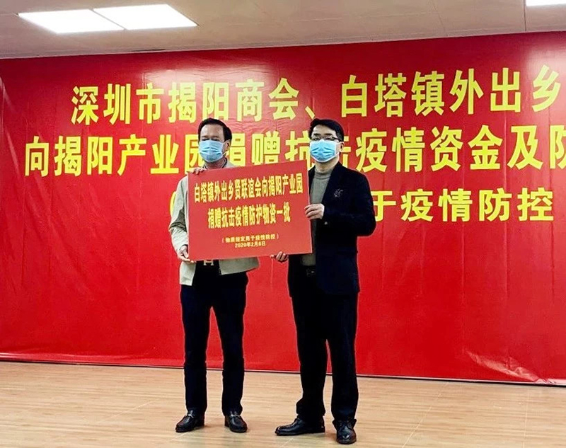 2月6日下午,深圳市揭阳商会、白塔镇外出乡贤联谊会向揭阳产业园捐赠抗击疫情资金及防护物资仪式在揭阳市产业园区管委会礼堂举行。