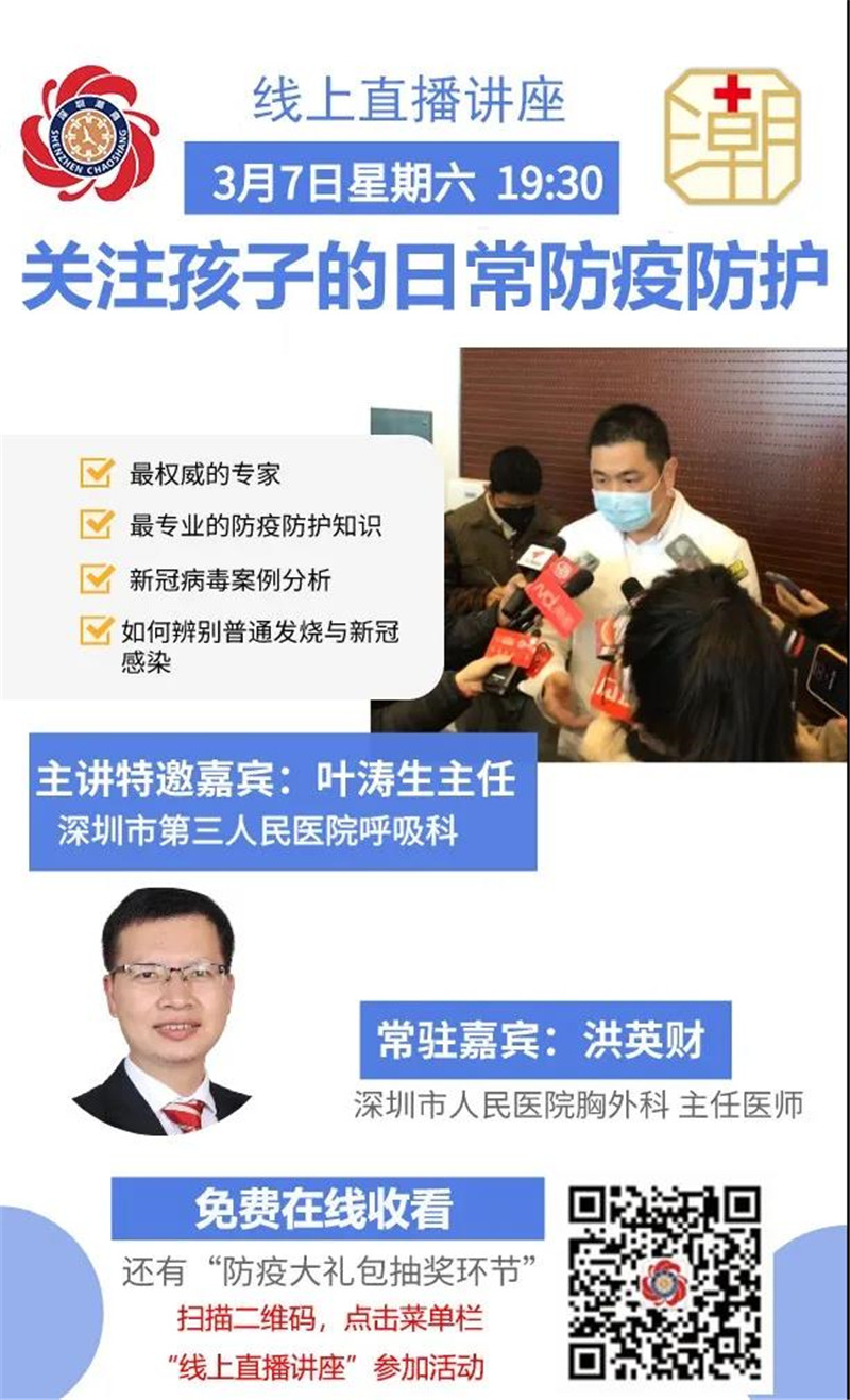 在抗击新冠肺炎疫情的特殊时期,下载安装 积极响应政府号召,强化“少出门、不聚集”的防控意识,创新开展线上活动。3月7日,我会健康工作委员会将与潮医会联合举办一场主题为“关注孩子的日常防疫防护”的线上直播讲座。下班回家应该怎么消毒才有效?老人和孩子应该怎么防疫防护?……深圳市第三人民医院呼吸科叶涛生主任,我会健工委执行主席、潮医会理事长、深圳市人民医院胸外科洪英财主任将从专业、权威的角度在线为大家答疑解惑。