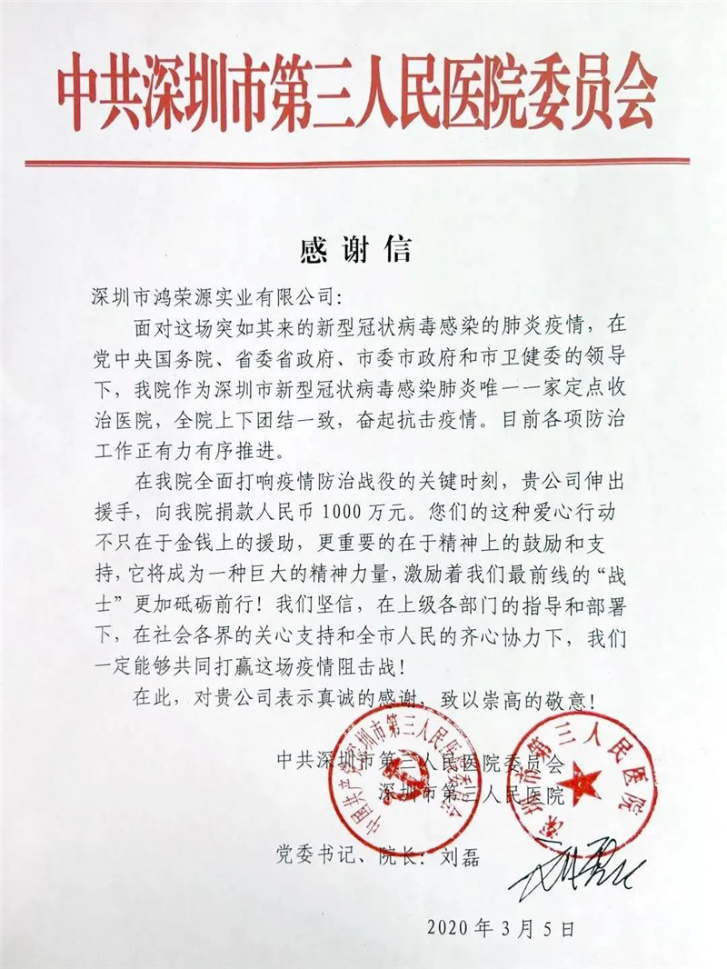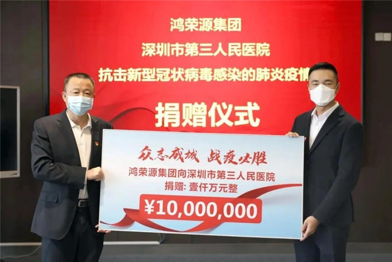 3月5日,我会荣誉会长赖海民单位鸿荣源集团通过深圳市慈善会向深圳市第三人民医院定向捐赠人民币1000万元,以实际行动致敬最美逆行者。