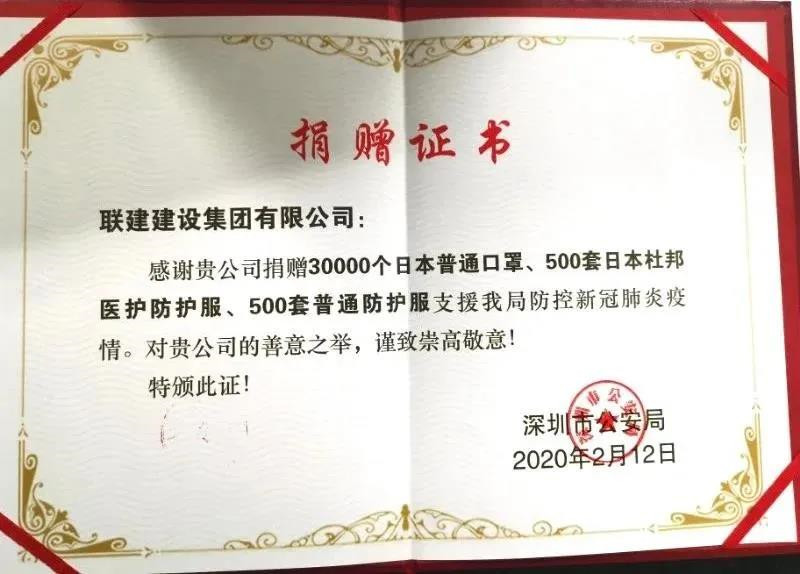 我会副会长郑克松单位联建建设集团有限公司捐赠30000个日本普通口罩、500套日本杜邦医护防护服、500套普通防护服,支援深圳市公安局防控新冠肺炎疫情。