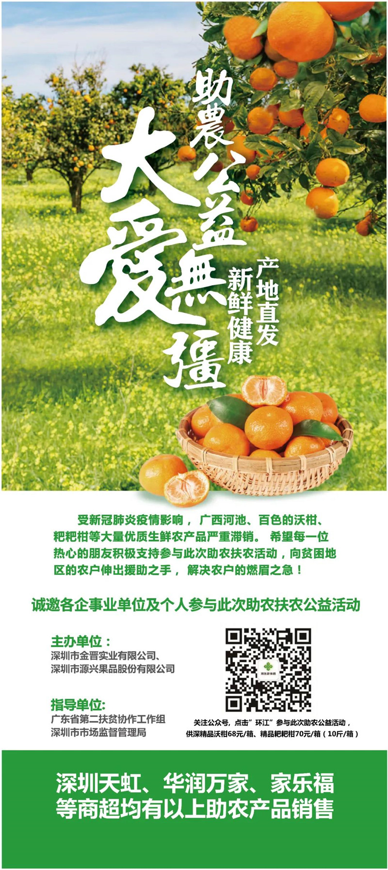 当前,受新冠肺炎疫情影响,深圳市对口扶贫地区广西河池市、百色市出现大量沃柑、耙耙柑等优质农产品严重滞销问题,果子烂地,农户艰难。为解决果农销售难题,我会常务副会长周南单位深圳市金晋实业有限公司、深圳市源兴果品股份有限公司积极响应广东省第二扶贫协作工作组号召,于2020年3月5日-3月31日举办“助农公益·大爱无疆”助农扶农活动,充分利用自身资源,积极行动,帮助果农渡过难关。