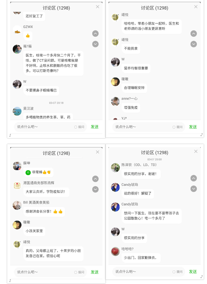 同时,此次直播也得到了会员企业们的热烈反响及点赞,好评如潮,大家纷纷在讨论区里留言,有的表示两位嘉宾主任分享的都是“干货”,实用易懂;有的表示这种方式互动性更强;有的表示带着孩子一起听课程,医生的嘱咐,孩子更能配合;还有的表示医务人员用生命守护我们的健康,要向他们致敬。