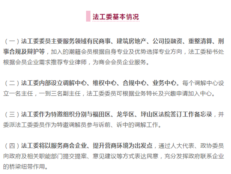 下载安装 一直以来高度重视法律服务工作,把法工委作为商会的重要工作委员会来建设和发展。法工委自成立以来,为商会会员单位提供了及时有效的法律咨询服务,最大限度维护会员企业的合法权益,并开展多种形式的法律培训,全方位提高会员企业的法律意识。