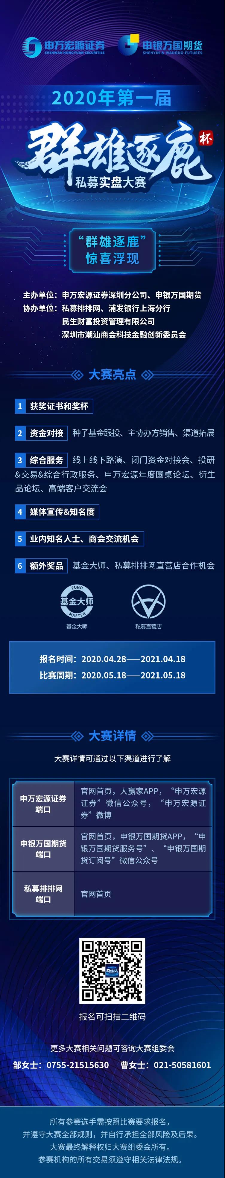 2020年第一届申万宏源证券&申万期货 “群雄逐鹿杯”私募实盘大赛开赛在即!此次私募大赛旨在为私募管理机构提供高端的自我展现与高效的投资交流平台,助力私募管理人提升投资能力、拓宽资金募集渠道,同时促进行业内资源的整合,为市场挖掘优质的私募基金管理人。