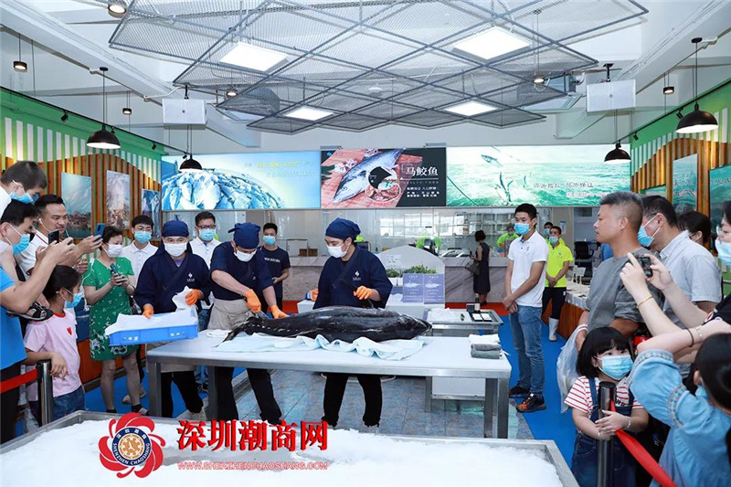 在现场,中渔大洲的工作人员都以饱满的热情和灿烂的微笑向新老客户和朋友展示了优质产品和热情服务。中渔大洲水产品展示交易中心总经理吴其承带着主播从刺身区—冻品区—活鲜区—冰鲜区一路参观介绍交易中心各功能区域分布及特色产品。值得一提的是在冰鲜区时常会举办开鱼活动,刺身师傅会在现场解剖上百斤重的鱼。当天我们正好遇到开大目金枪鱼,色泽鲜红、口感鲜美不腻,引来大批顾客的观摩和品尝。
