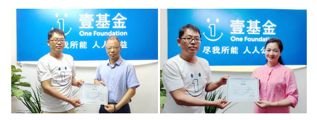 壹基金综合事务部主任聂良非为我会轮值会长何奕鹏和文化顾问李红梅颁发感谢信