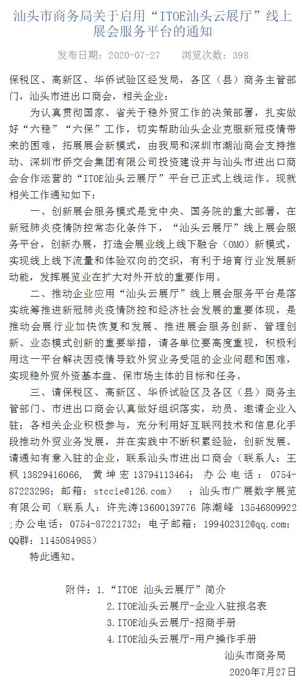期间,汕头市商务局刘文华局长到会指导,并指出,市政府对“ITOE汕头云展厅”项目十分重视,是市商务局和下载安装 支持推动,由深圳市侨交会集团有限公司投资建设并与汕头市进出口商会合作运营的线上展会服务平台。“ITOE汕头云展厅”可满足企业展览展示、交流交易、以及开展国际贸易相关配套服务等需求,切实帮助汕头企业克服新冠疫情带来的外贸业务受阻问题和困难,实现稳外贸外资基本盘、保市场主体的目标和任务。