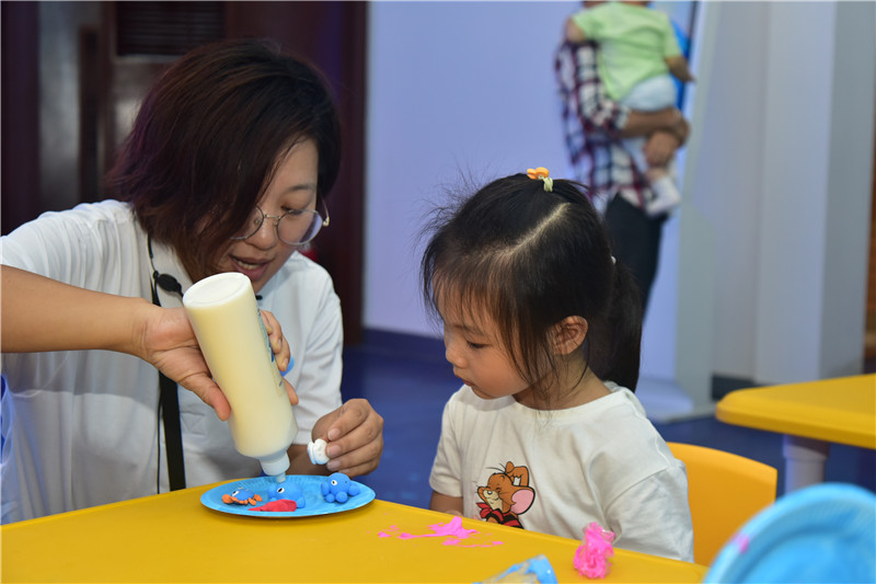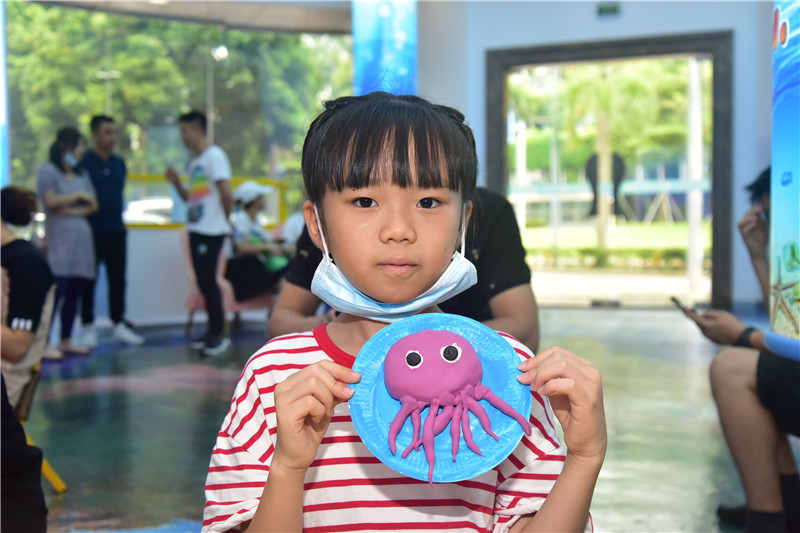 活动主要分为:讲解四大经济渔类知识、手工制作想象中的海洋生物形象作品、体验海洋地图配对游戏以及品尝健康美味的海洋食品四个环节。