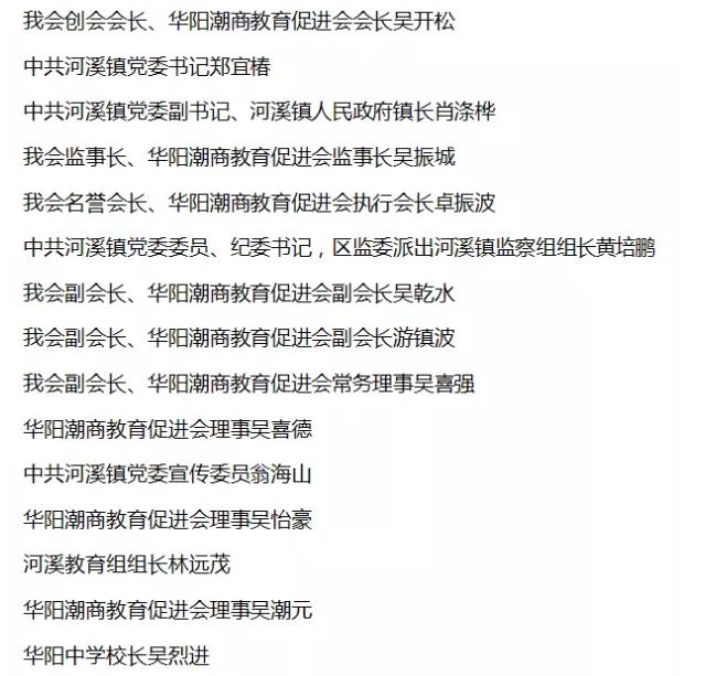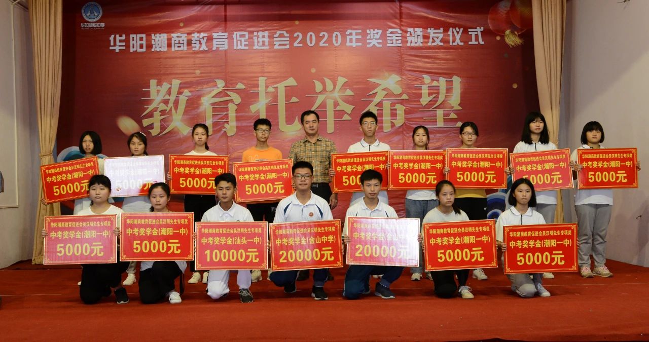为树立典型、表彰先进、弘扬正气,凝聚力量,激励潮商华阳中学师生继续奋发进取,华阳潮商教育促进会决定奖励吴仁耀同学等37位在小学升初中毕业考成绩突出优秀生源学生;奖励刘奕槟同学等95位在中考中成绩突出的优秀毕业生;奖励许丽明老师等37位九年级毕业班教师;资助吴泽鹏同学等13位优秀毕业生。希望受表彰的师生珍惜荣誉,以更高的标准严格要求自己,不忘初心,继续努力,争取来年再创佳绩。
