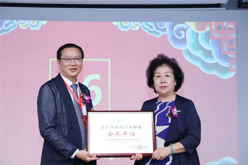 深圳市企业联合会党委书记于剑女士(右)为深圳市校服行业协会第二届理事会会长陈汉武(左)授牌
