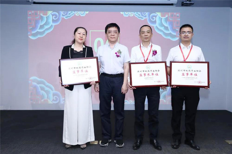 深圳市社会组织总会联合党委书记、纪委书记张武波(左二)为深圳市校服行业协会第二届监事会监事长尹成刚,监事温小霞、苟宏授牌