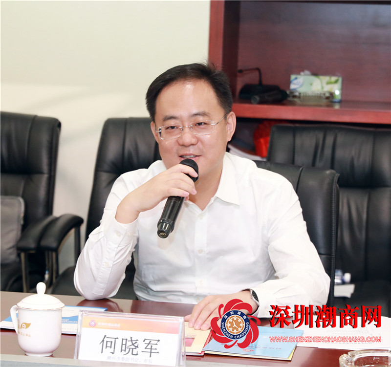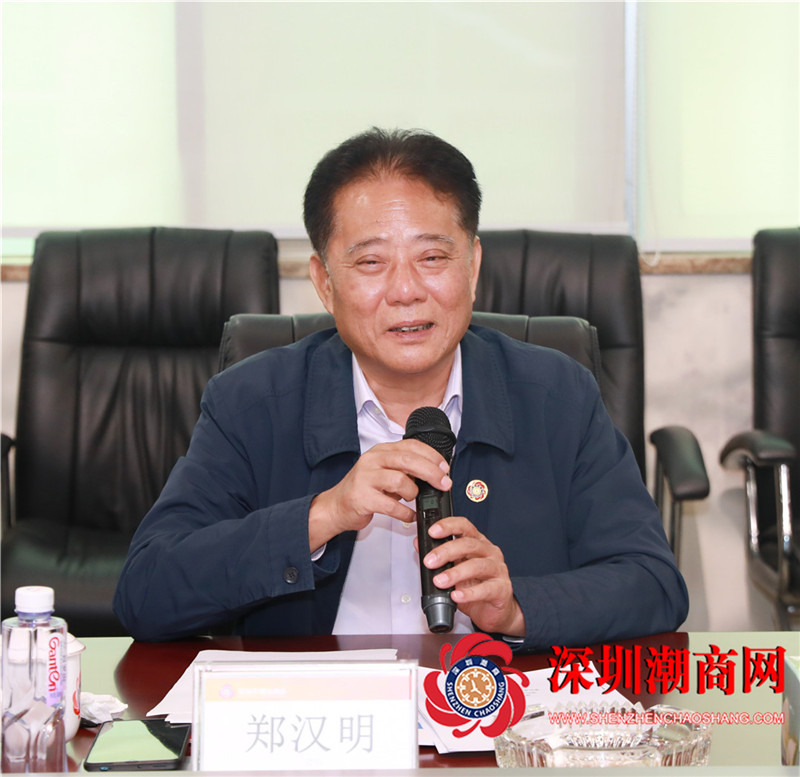 郑汉明会长对何晓军市长一行的到来表示热烈欢迎,介绍了商会是由潮汕四市在深企业家共同发起成立的集团式商会,在经贸合作上积极打造了三大平台——“国际合作平台”(国际潮商经济合作组织)、“金融服务平台”(潮商东盟投资基金)、“产业投资合作平台”(侨交会、云展厅)。他表示,去年潮州市参展了侨交会,设立潮州馆、举办“潮州节”系列活动,展示推介潮州经济、文化形象及营商环境。今年侨交会搭建线上展会服务平台,直接面对面跟采购商进行交流对接,已经在线上开设了阿联酋、迪拜、菲律宾、日本等专场,带来许多采购需求。希望有机会与潮州市合作,设立潮州云展厅,把潮州的中小型外贸企业集中展示,推动企业信息互动,打造外贸新业态。