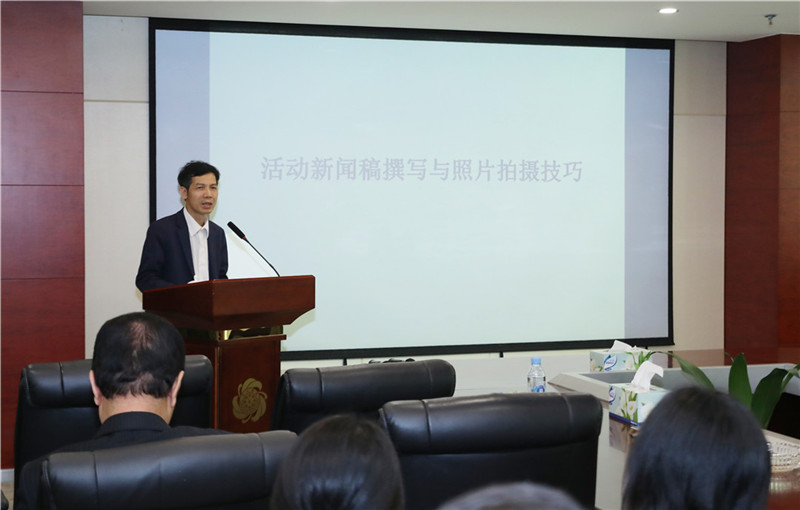讲座中,江创旭主任结合自身多年的媒体从业经验,分析当前媒体的发展趋势,阐述了传统媒体与新媒体的区别,从稿件撰写到照片拍摄,为大家讲解了新闻的概念及特点,以及采用倒金字塔结构方式突出活动主题与意义,吸引读者阅读兴趣。他引用生动的新闻报道案例,图片景别的选择等,解读新闻发布特点,传授新闻宣传秘诀。