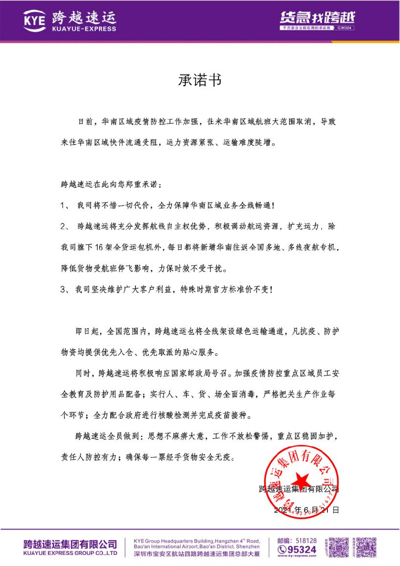 “因疫情导致华南机场航班大面积取消,跨越速运将不惜一切代价,利用自有全货机并额外增加临时包机,以诚信立业,信守承诺,全力保障客户时效。”