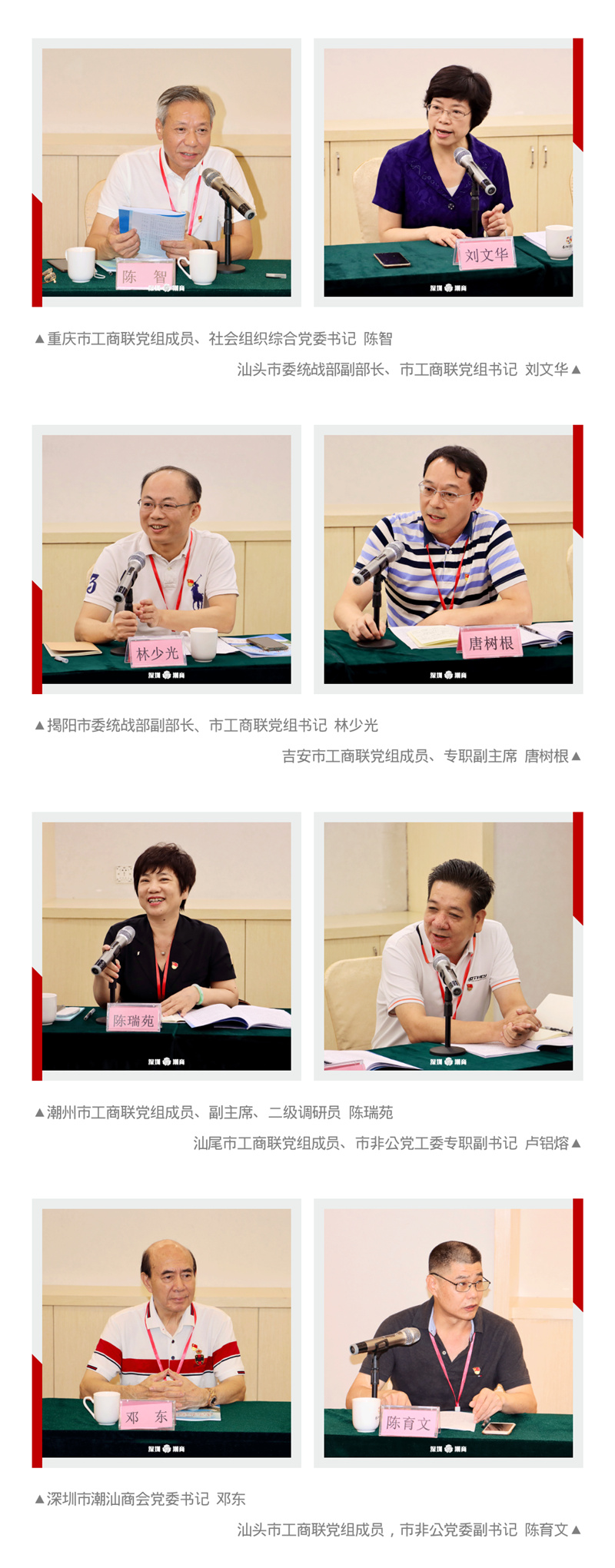 重庆市工商联党组成员、副主席、社会组织综合党委书记陈智,汕头市委统战部副部长、市工商联党组书记、市非公有制经济组织党委书记刘文华,揭阳市委统战部副部长、市工商联党组书记、市非公党委书记林少光,吉安市工商联党组成员、专职副主席唐树根,潮州市工商联党组成员、副主席、二级调研员陈瑞苑,汕尾市工商联党组成员、市工商联二级调研员、市非公有制经济组织党工委专职副书记卢铝熔等出席会议。