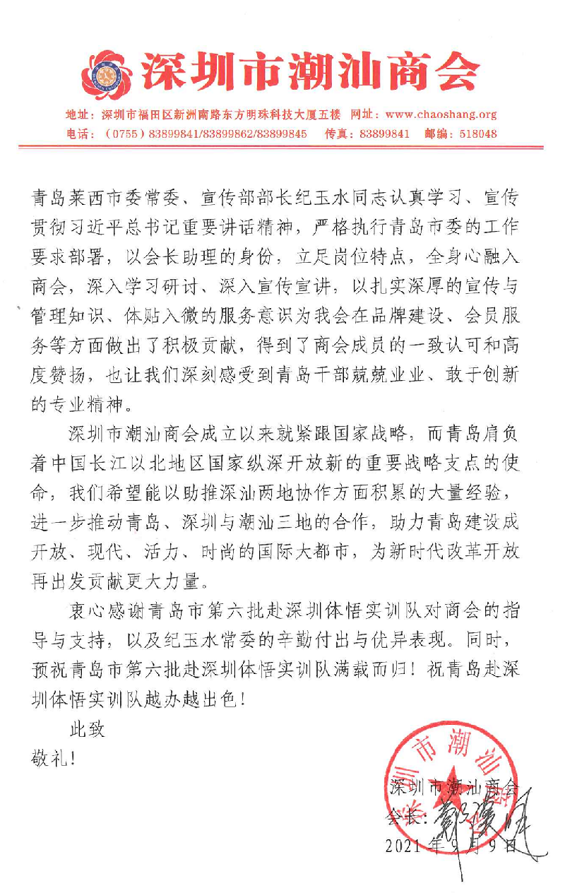 为表彰青岛市第六批赴深圳体悟实训队对商会的指导与支持,以及纪玉水常委的辛勤付出与优异表现,我会谨以此信致以衷心的感谢和高度的赞扬!