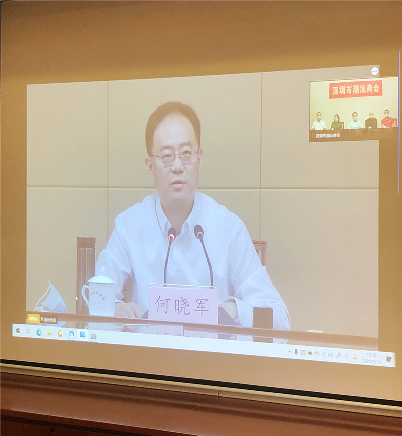 2021年9月16日,在中秋佳节来临之际,潮州市召开国内主要潮商会视频座谈会,邀请北京、上海、深圳多地潮商会会长及潮商代表以视频连线方式进行座谈,敦睦乡情乡谊,共话潮州发展。潮州市委书记何晓军、市长何广延出席会议,我会会长郑汉明出席会议,并就如何发挥好商会作用、推动潮州高质量发展建言献策。