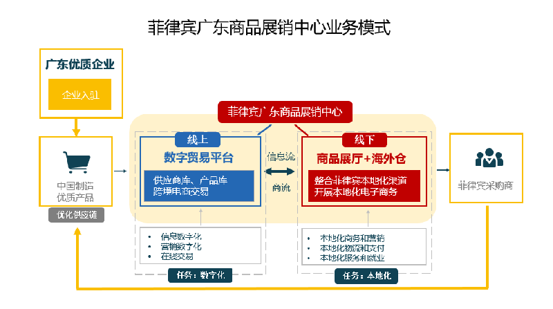启动仪式上,林会长介绍了菲律宾广东商品展销中心的基本情况,商业规划以及给广东和菲律宾两地贸易带来的创新和便利举措,并特别介绍了线上线下相融合的数字化运营模式。通过将广东优质商品样品和货物前置至菲律宾,通过本地化团队服务菲方贸易商,并与本地电商平台打通,实现中菲贸易之间B2B2C新通道。