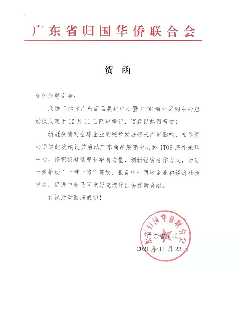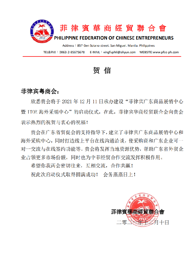 菲律宾华商经贸联合会贺函