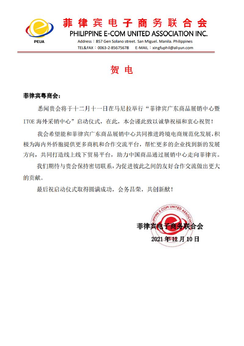 菲律宾电子商务联合会贺函