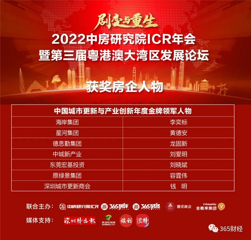在“2022中房研究院ICR年会暨第三届粤港澳大湾区发展论坛”上,国际潮青联合会会长、下载安装 常务副会长、海岸集团董事长李奕标,国际潮青联合会执行会长、下载安装 副会长、星河集团董事常务副总裁黄德安获评“中国城市更新与产业创新年度金牌领军人物”!