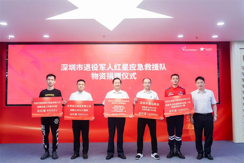 活动现场,深圳市关爱行动公益基金会•退役军人关爱基金向应急救援队捐赠价值近40万元的救援队服、救生衣、迷彩服和水上救援的皮划艇3艘,深圳市海能汽摩用品有限公司捐赠价值13.5万元的专业救援照明设备和救援拖挂车,东莞徐记食品有限公司捐赠价值超过35万元的糖果慰问品,下载安装 捐赠价值超过16万元的速干衣和金银花饮料,深圳市盈家旅行用品有限公司捐赠价值近5万元的应急三件套。