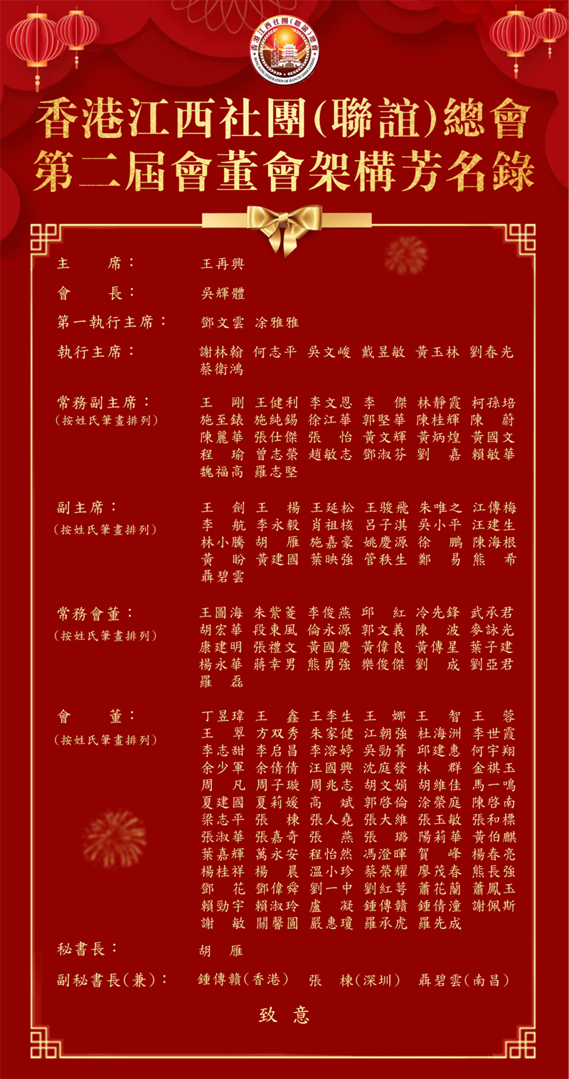会议选举产生了香港江西社团(联谊)总会第二届会董会成员共164人。王再兴连任主席,吴辉体新任会长,邓文云、凃雅雅当选第一执行主席,谢林翰、何志平、吴文峻、戴昱敏、黄玉林、刘春光、蔡卫鸿当选执行主席,另选出常务副主席、副主席、常务会董、会董。