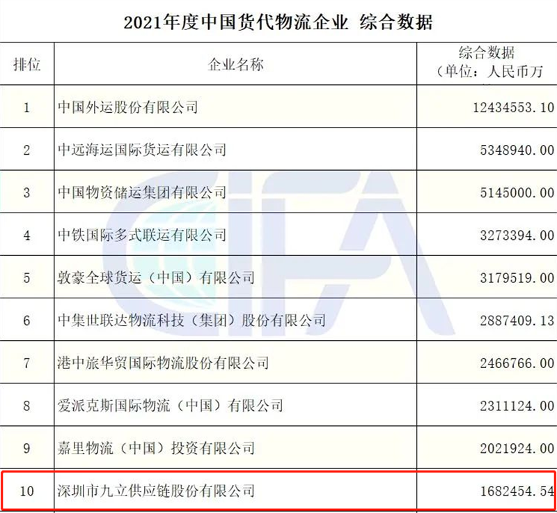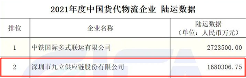 中国国际货运代理协会公布的2021年度中国货代物流企业数据(初公示)名单,热烈祝贺我会常务副会长邹浩企业九立股份荣获2021年度中国货代物流企业民营企业数据第一名;陆运数据第二名;综合数据第十名!