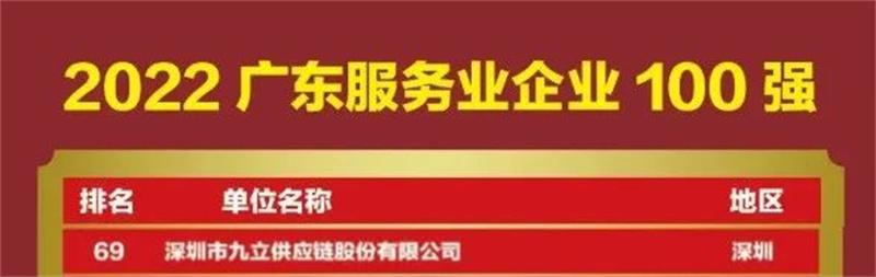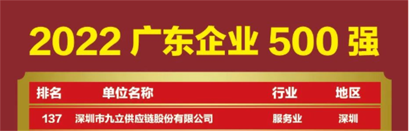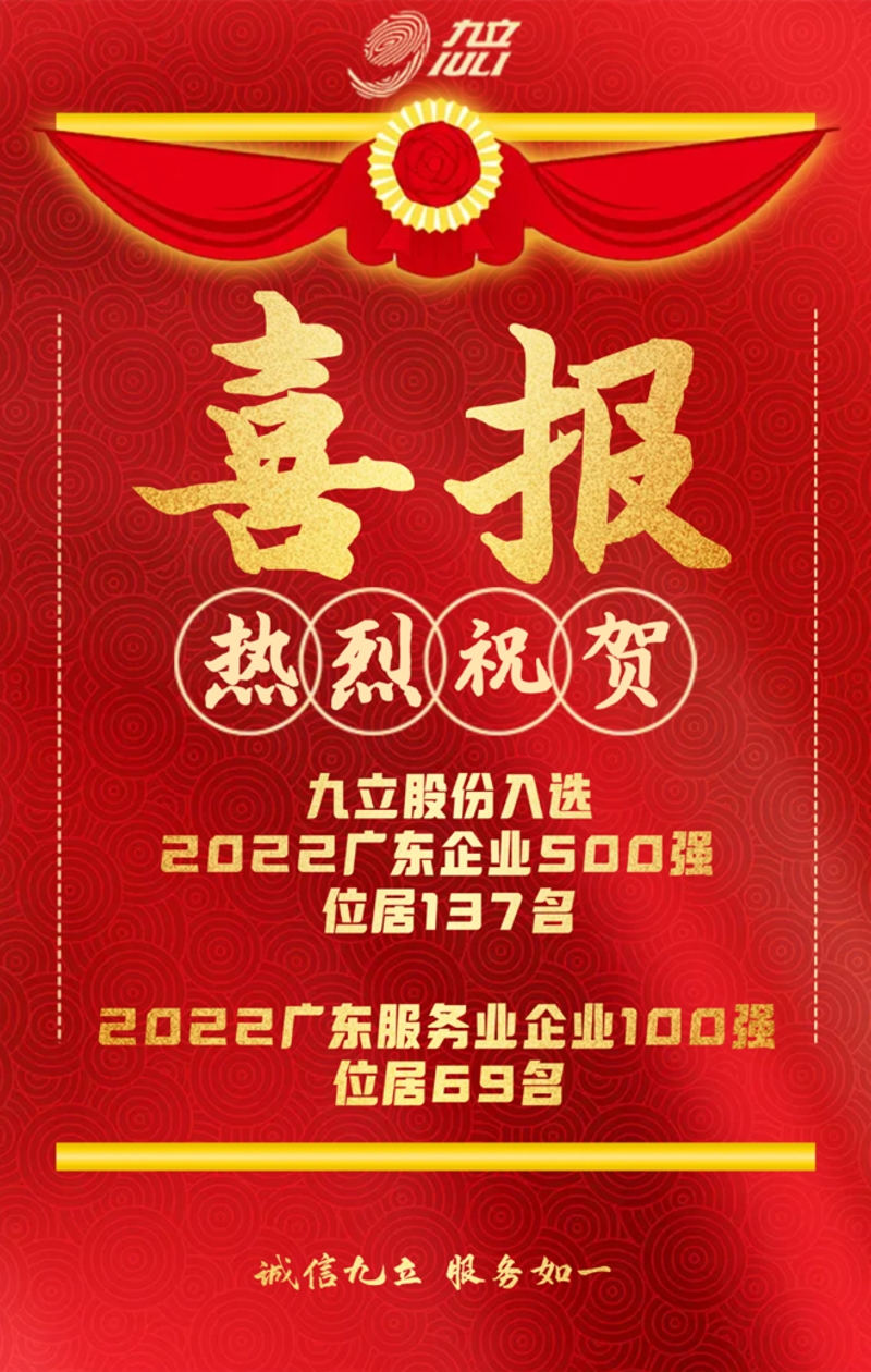 热烈祝贺九立股份入选2022广东企业500强,位居第137名;2022广东服务业企业100强,位居第69名!