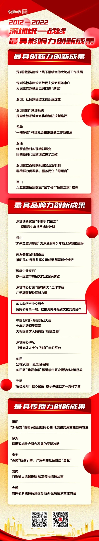 为深入学习贯彻党的二十大精神,生动全面展示近年来深圳统一战线工作的创新成果,深圳市委统战部与南方报业传媒集团深圳分社联合推出“2012—2022:深圳统一战线最具影响力创新成果大型全媒体策划”。经过科学公正评选,现评出最具创新力创新成果8项、最具品牌力创新成果10项、最具传播力创新成果5项。我会支持打造的华人华侨产业交易会(简称:侨交会)荣膺“最具品牌力创新成果”。