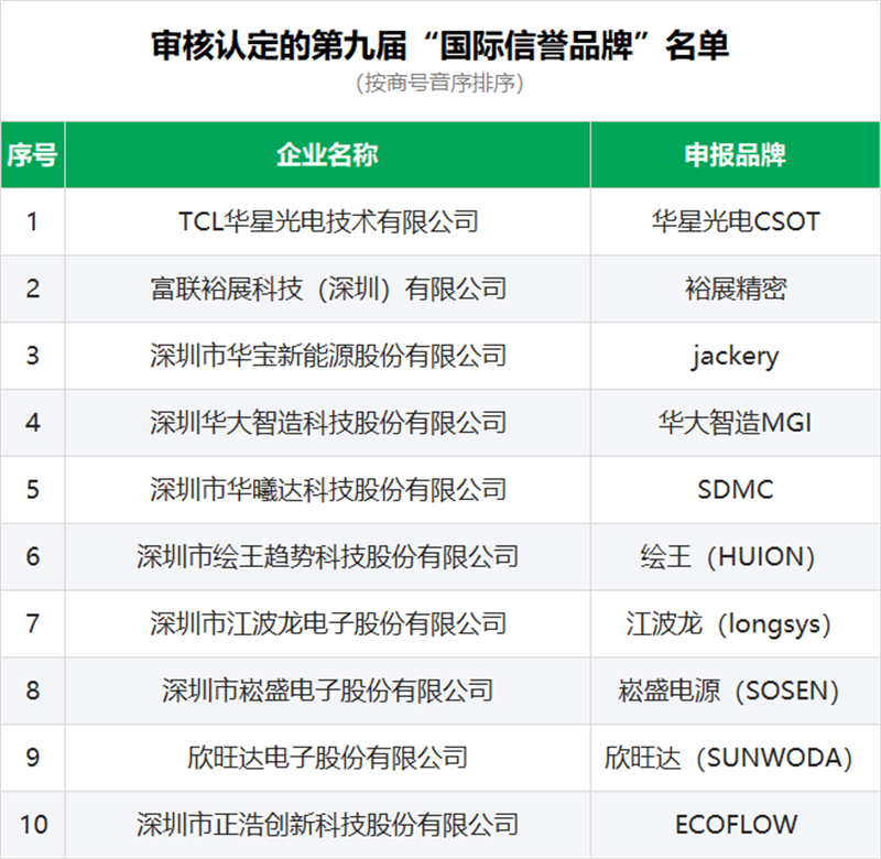 3月16日,深圳知名品牌评价委员会召开第二十届“深圳知名品牌”评审会议,欣旺达、华大智造等116个品牌入选新一届“深圳知名品牌”,比亚迪、艾美特等279个品牌通过复审,继续享有“深圳知名品牌”称号。TCL华星等10个品牌入选第九届“国际信誉品牌”,将报请联合国工业发展组织审核认定。