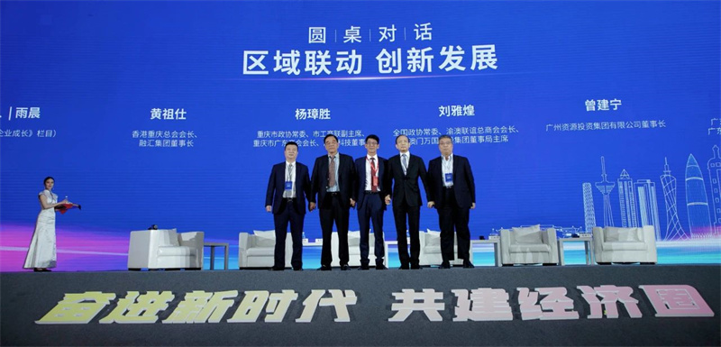 圆桌对话环节,全国政协常委、渝澳联谊总商会会长、澳门万国控股集团董事局主席刘雅煌,重庆市政协常委、重庆市工商联副主席、重庆市广东商会会长、渝丰科技股份有限公司董事长杨璋胜,香港重庆总会会长、融汇集团董事长黄祖仕,广州资源投资集团有限公司董事长曾建宁,广东省家居建材商会会长、广东尚高科技有限公司董事长曹宇勇等嘉宾围桌论道,聚焦新形势、新业务、新模式,围绕投资重庆的优势、粤港澳大湾区和成渝地区双城经济圈如何加强区域协作等话题进行深度探讨,碰撞民营经济创新发展的火花。
