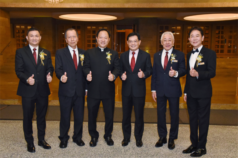 在新加坡副总理兼经济政策统筹部长王瑞杰(前排中)的见证下,第47届会长吴木兴(前排右)代表全体董事会,和第46届会长曾建权(前排左)完成交接仪式