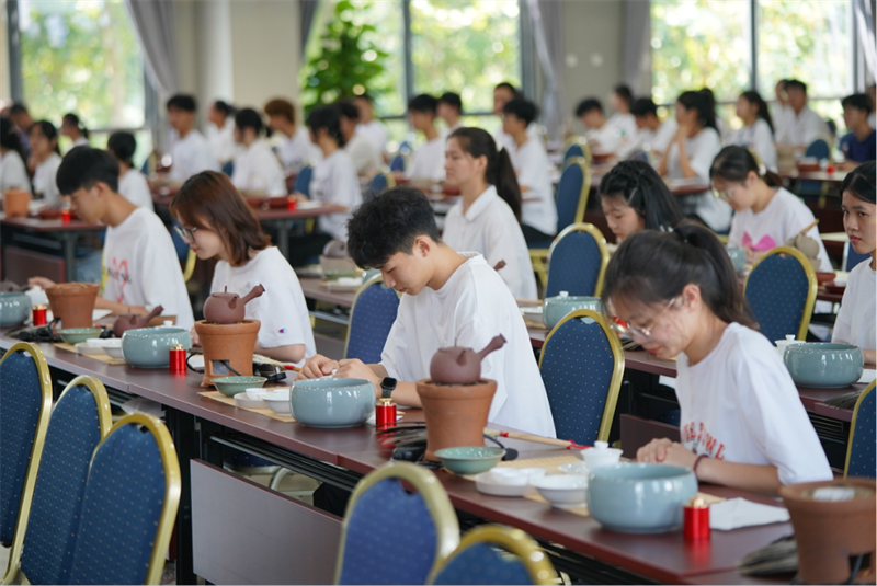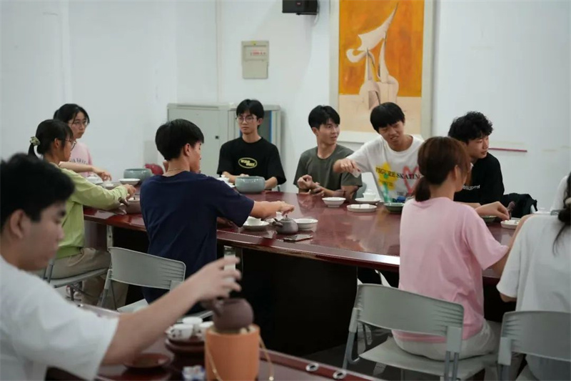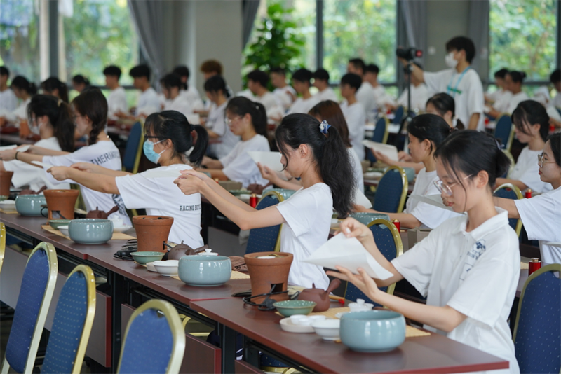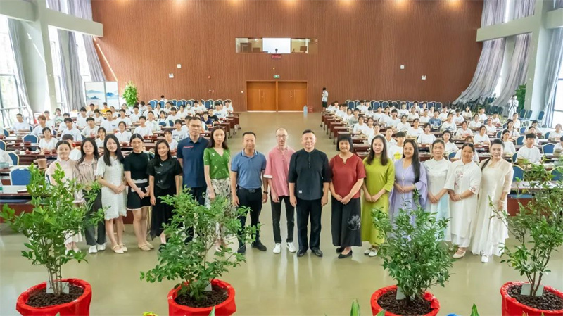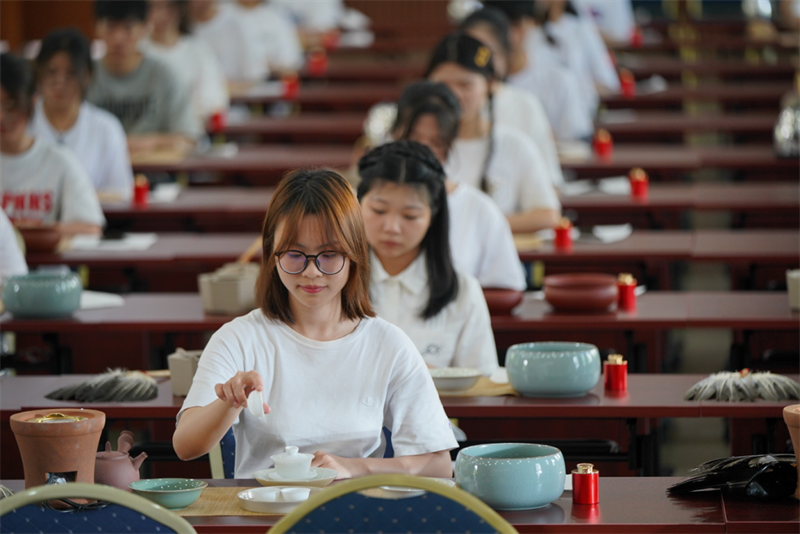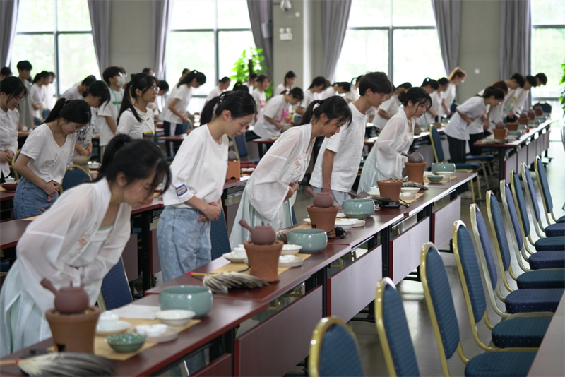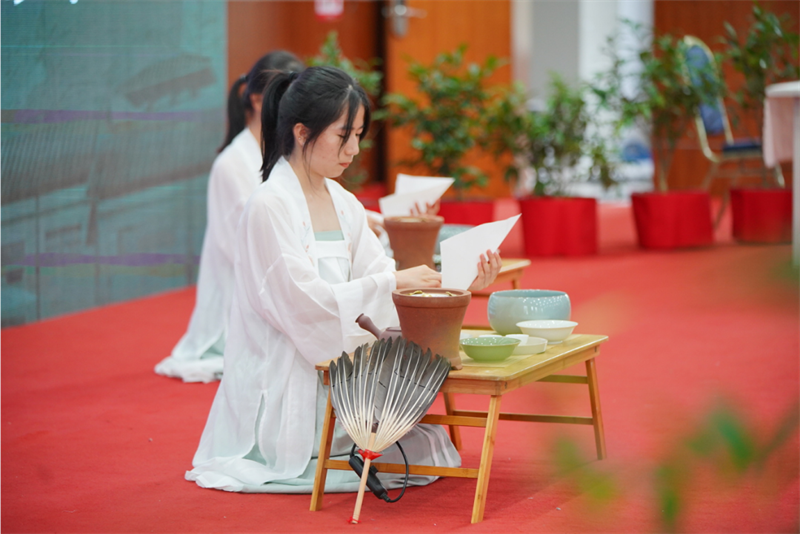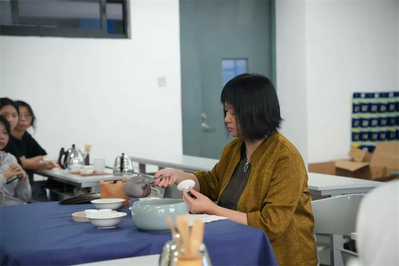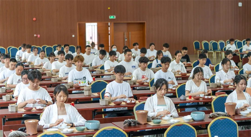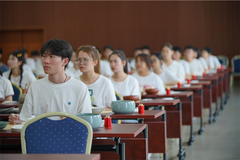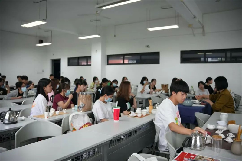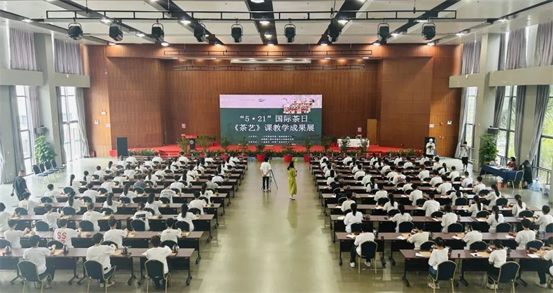 来自学校各专业的108位《茶艺》课学生与潮州单丛茶(文氏)制作技艺第五代传承人林秋君女士、高级茶艺师马苑瑞女士共同演绎了潮州工夫茶茶艺,以实际行动传承中华优秀传统文化、弘扬中国茶文化。