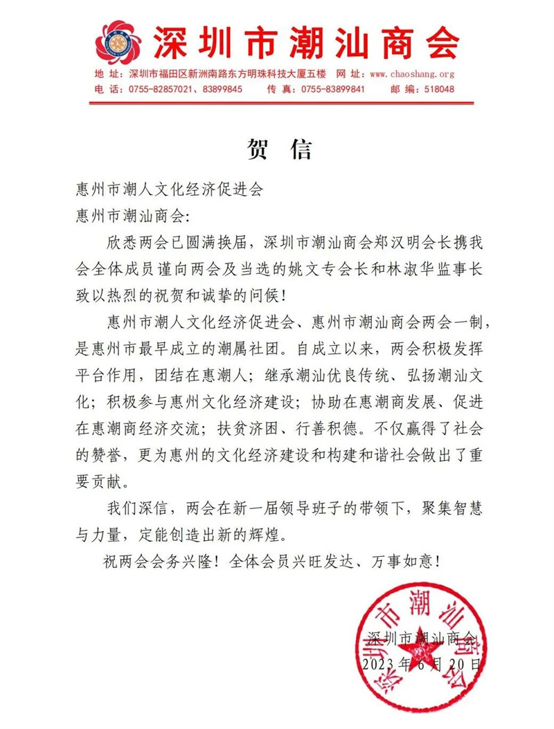 7月7日,惠州市潮人文化经济促进会(简称惠州潮人会)第四届理(监)事会就职典礼暨广东潮剧院(惠州)潮剧·潮乐传承中心揭牌仪式隆重举行,本次大会主题为“潮商惠聚 文化赋能”,下载安装 向大会发送贺信祝贺。惠州市有关部门领导、潮汕四市家乡领导、国际潮团组织和全国各地商会社团以及惠州、汕头、潮州、揭阳、汕尾五市的潮汕籍企业家等700余人齐聚东江边,共谋发展共话未来。