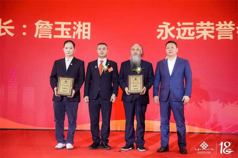詹表会长为深圳市饶平商会创会会长詹玉湘(代领),永远荣誉会长谢学源授牌