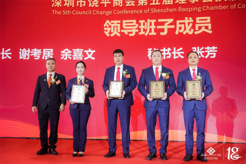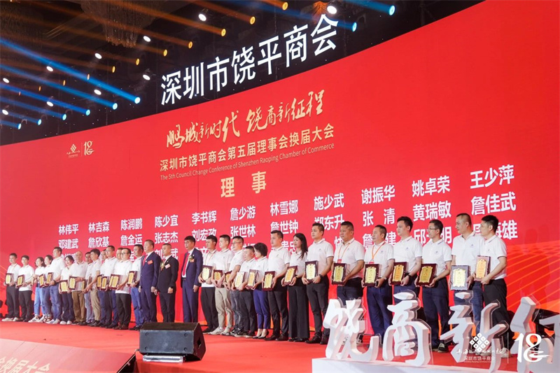 会长詹表,执行会长谢考居、余喜文为深圳市饶平商会第五届常务理事:郑秦峰,詹繁荣,詹惠阳,刘崇祥,詹龙水,余清风,黄泽平,詹海滨,文朝生,詹大丈,詹素芬,邱连升,詹雪光,谢何林,张惠萌,刘秀青,詹建贞授牌。
