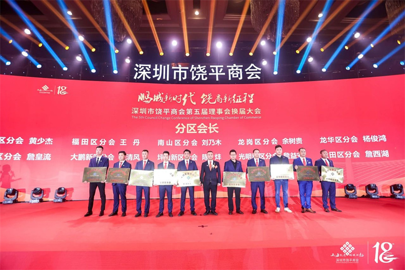 詹表会长为深圳市饶平商会十大分区会长:宝安区分会会长黄少杰,福田区分会会长王丹,南山区分会会长刘乃木,龙岗区分会会长余树贵,龙华区分会会长杨俊鸿,罗湖区分会会长詹皇流,大鹏新区分会会长黄泽平,坪山新区分会会长陈炐,光明新区分会会长詹益安,盐田区分会会长詹西湖授牌。