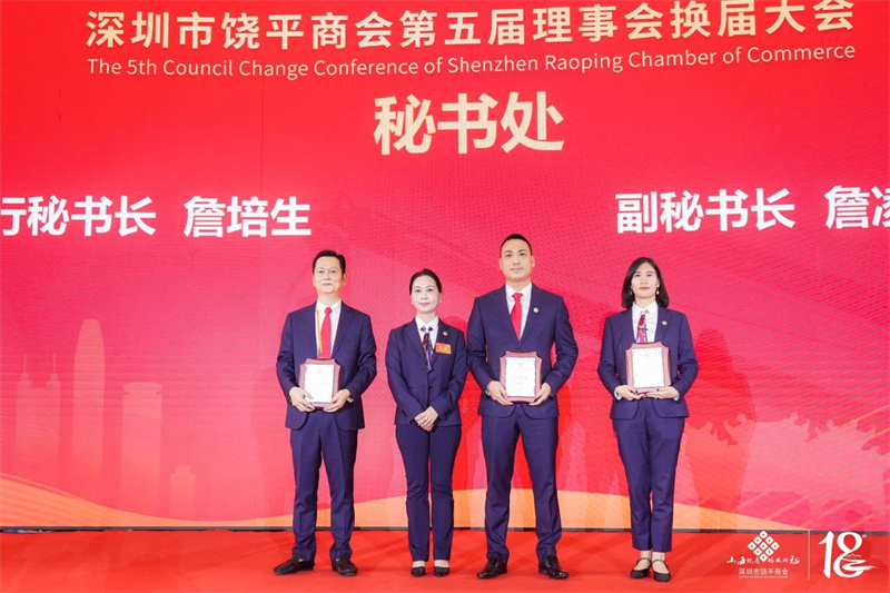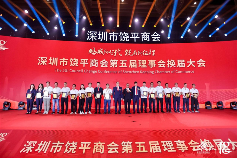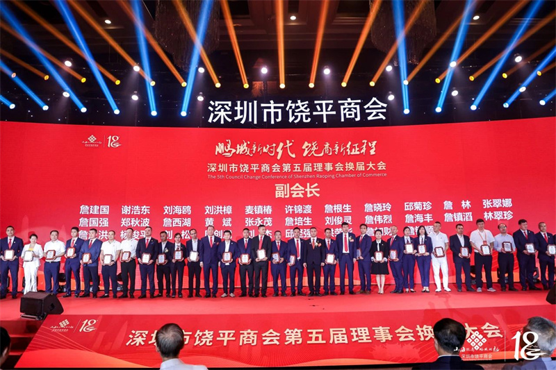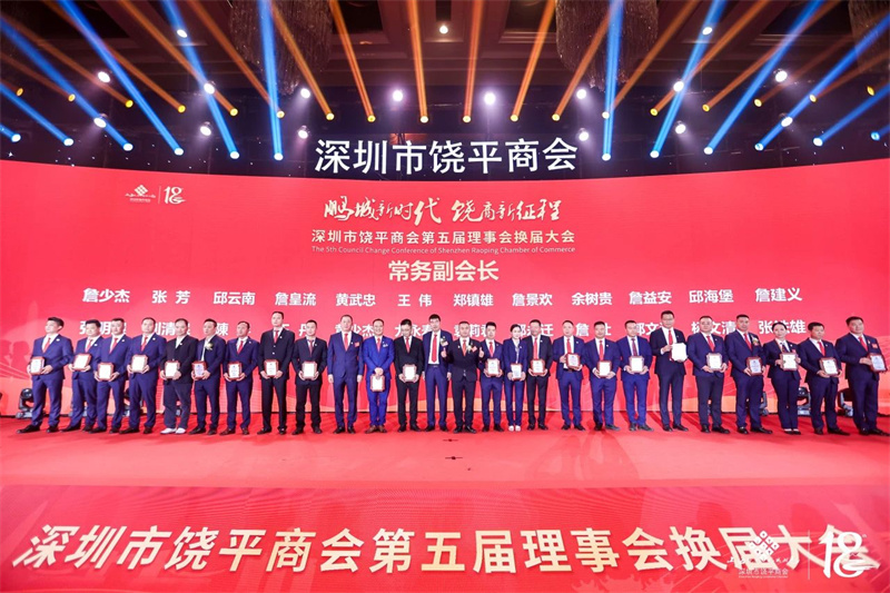 会长詹表,执行会长谢考居、余喜文为深圳市饶平商会第五届常务副会长:詹少杰,张芳,邱云南,詹皇流,黄武忠,王伟,郑镇雄,詹景欢,余树贵,詹益安,邱海堡,詹建义,张明浪,刘清泉,陈 炐,王丹,黄少杰,尤永寿,袁莉君,詹仕,郭文浒,詹伟坚,杨文清,张铁雄授牌。