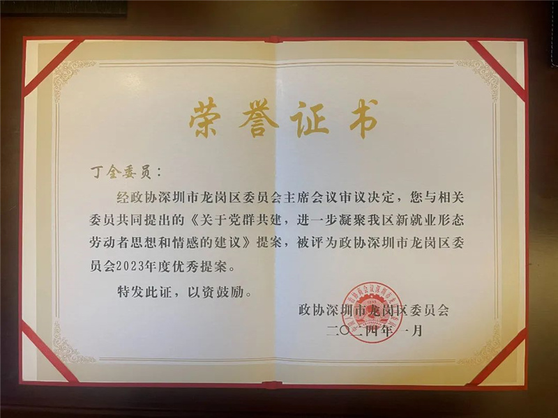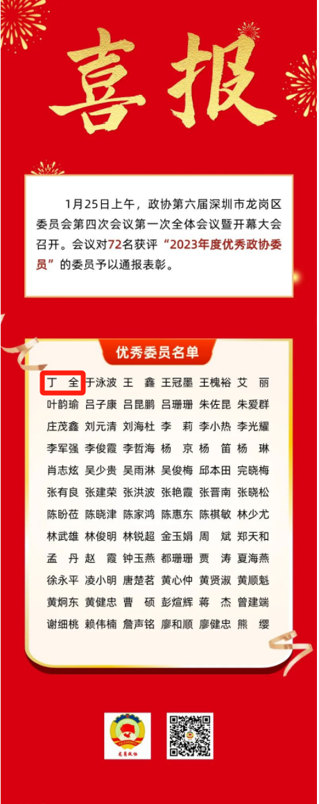 我会常务理事、龙岗区政协委员丁全获评“2023年度优秀政协委员”,与相关委员共同提出的《关于党群共建,进一步凝聚我区新就业形态劳动者思想和情感的建议》提案获评“2023年度优秀提案”。