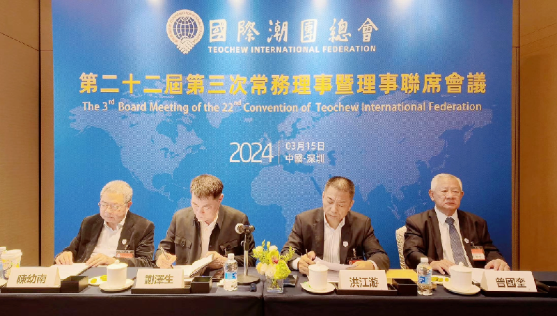 2024年3月15日下午,國際潮團總會在深圳召開第二十二屆第三次常務理事暨理事聯席會議,30多位常務理事、理事及代表齊聚鵬城,第一時間學習領會習近平總書記在全國兩會上的重要講話和全國兩會精神,深入學習交流,暢談感想體會,共話潮團發展,傳遞信心力量。國際潮團總會謝澤生主席主持會議並講話。國際潮團總會副主席洪江游、執行主席陳幼南、執行副主席曾國奎等參加會議。我會創會會長、國際潮商經濟合作組織主席吳開松,我會駐會會長、國際潮商經濟合作組織執行主席黃育宏参加會議。