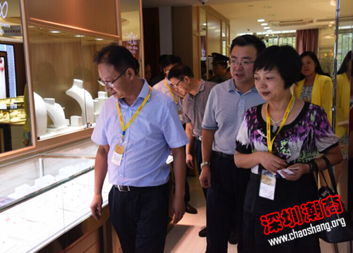 领导的陪同下实地考察了我会名誉会长周桃林旗下企业——深圳百泰投资控股集团有限公司。参访团在参观了百泰集团后对潮商在深圳珠宝业的成就表示赞赏,并希望能多加交流合作,发挥重庆在珠宝产业的政策优势,促进双方共同发展。