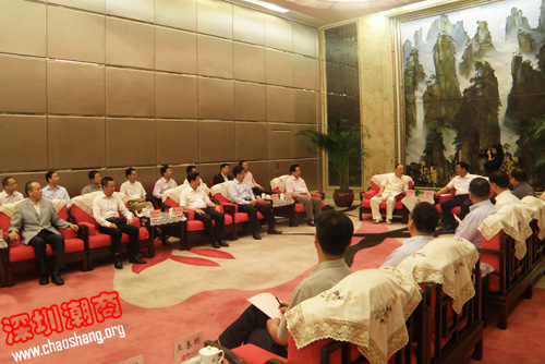 何报翔向潮商介绍了湖南开放型经济发展和湘粤两地经贸合作的情况。他说,近年来,湖南与广东经贸交流日益密切、势头越来越好,特别是自湘南地区获批成为国家承接产业转移示范区以来,吸引了广东省一批投资规模大、综合效应高的加工贸易项目落户湖南。希望广大潮商常来湖南实地考察、投资兴业、共促发展。