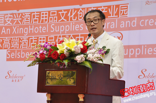 我会副会长、恒安兴集团董事长陈森豪致辞介绍,恒安兴酒店用品文化创意产业园经过近两年的筹建,于2013年1月竣工,是国内首家也是目前唯一一家高端酒店用品文化创意产业园。产业园致力于将文化创意、品位设计融于产品里,赋予酒店用品文化内涵,提高产品附加值,打造全球高端酒店用品综合解决方案,为酒店创造利润和大幅度降低运营成本,推动和带动行业的发展。希望通过本次文博会让世界认识、了解恒安兴产业园,提高园区知名度。